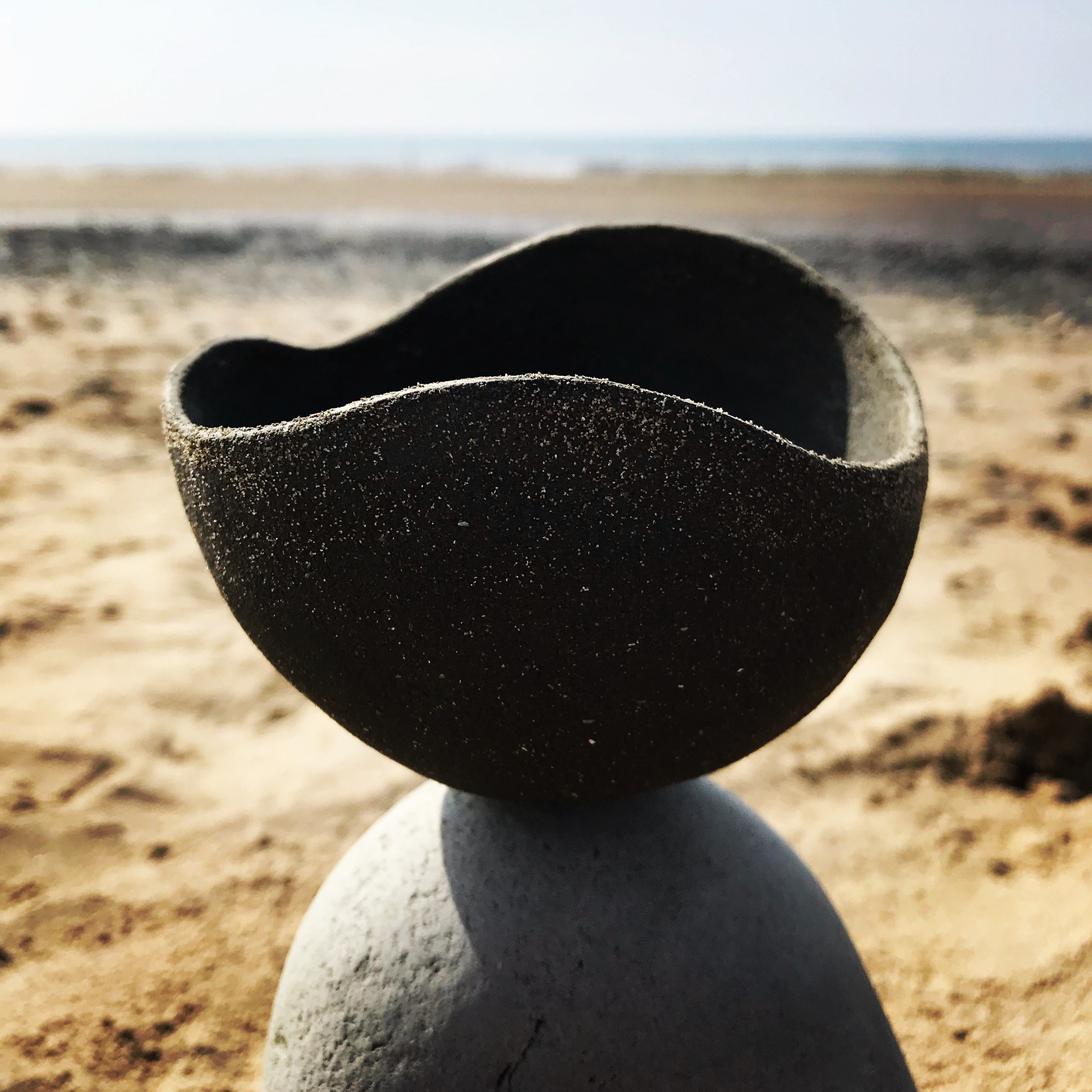 Beach clay, rock outcrop. Clay bowl formed over rock, coated with sand. Rain and waves washed it away